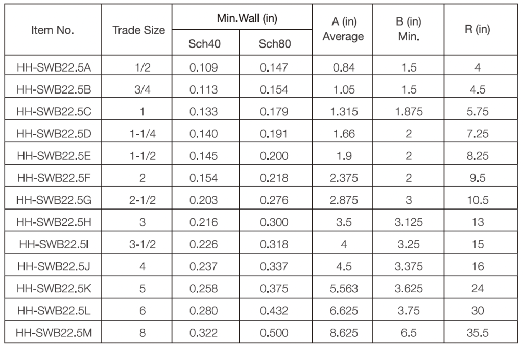 • Bell end standard radius elbow is used to change the direction of a conduit run by 22.5 degrees.
